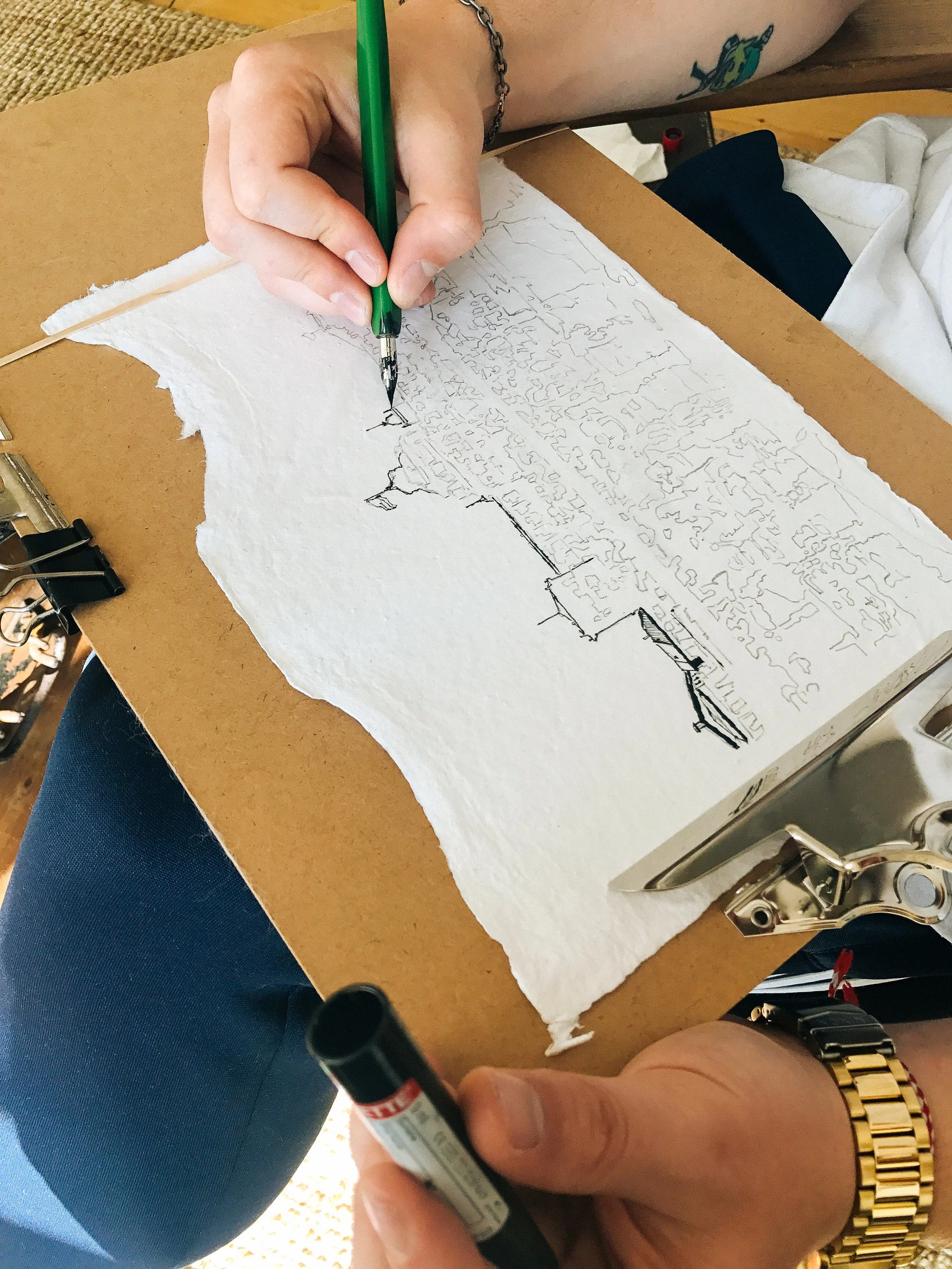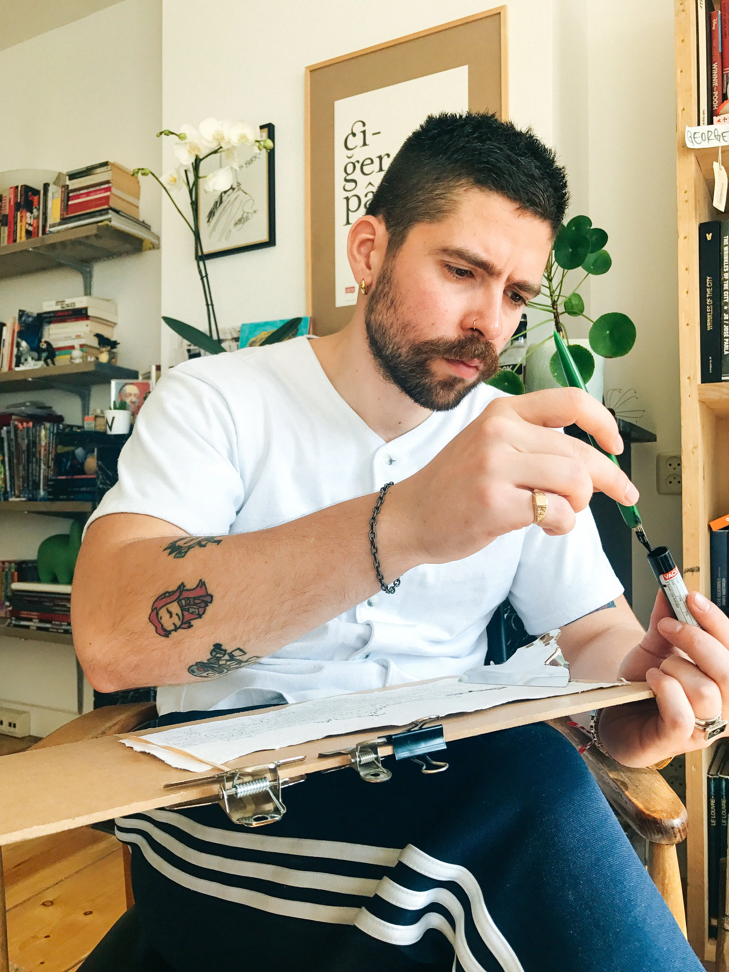 Berk Senturk is a Turkish Illustrator, currently living in The Hague with his half French half Portuguese wife, Camille. Owner and creator of the brand ‘Mano Figa’, he is the first artist to collaborate and sell his products in our shop. His works have different themes and mediums, including black and white drawings of old cities, watercolour compositions to terrariums with pop culture characters.